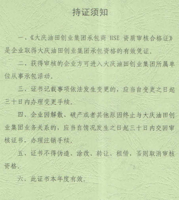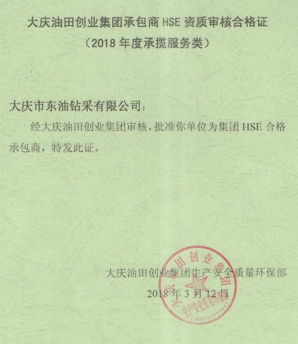圖片新聞:大慶油田創(chuàng)業(yè)集團承包商HSE資質(zhì)審核合格證(2018年度承攬服務(wù)類)